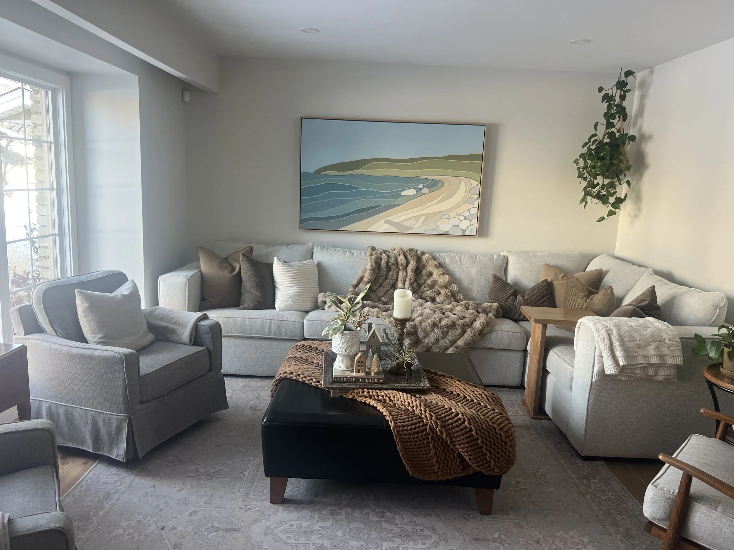 Inspired by a family’s memories of Victoria Beach, this piece was created from a meaningful photo using colours that reflect both the shoreline and the home it now lives in.