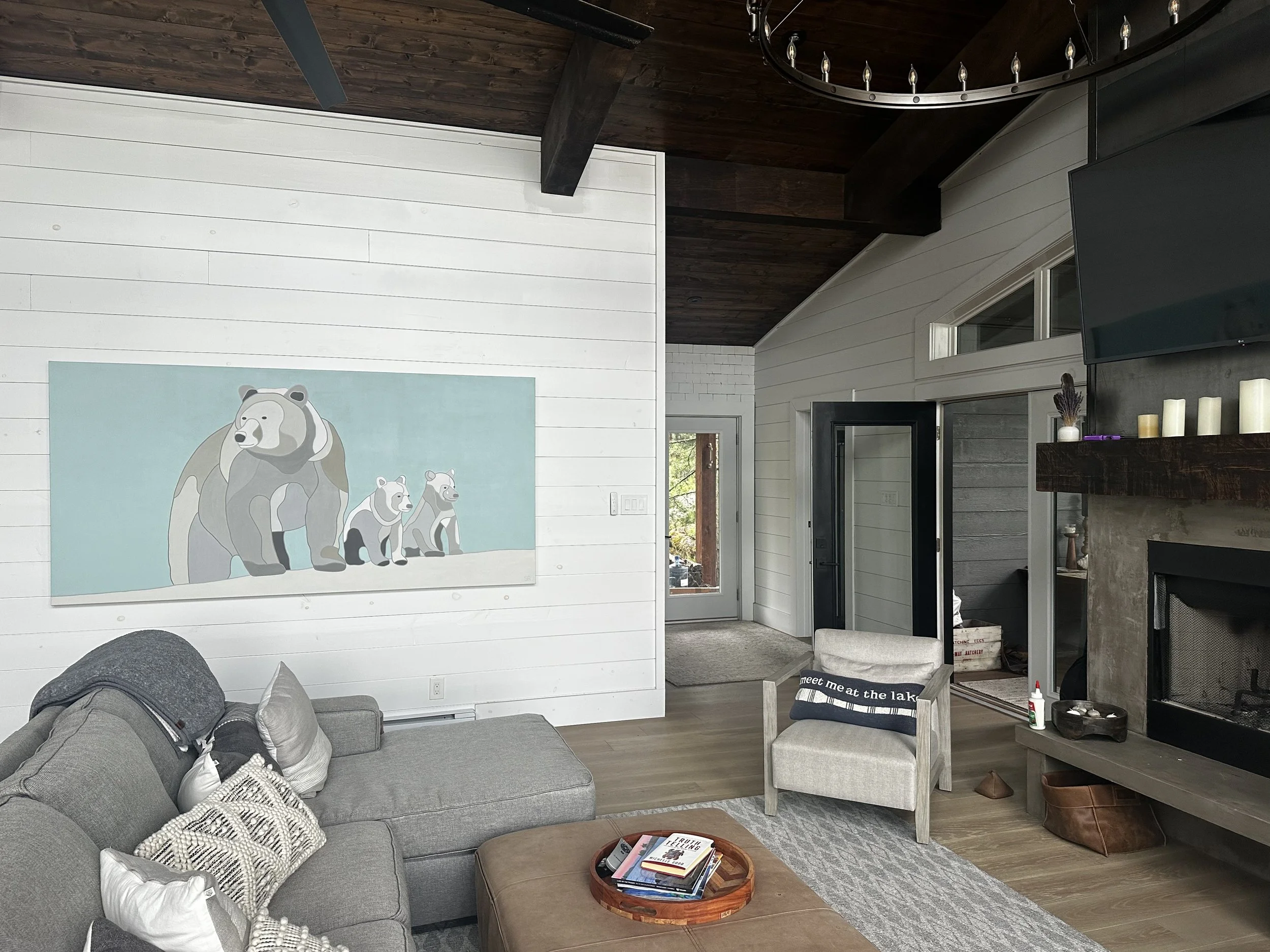 A custom three-bear composition for a modern island cottage on Lake of the Woods, with colours chosen to echo the cottage interior and surrounding landscape.